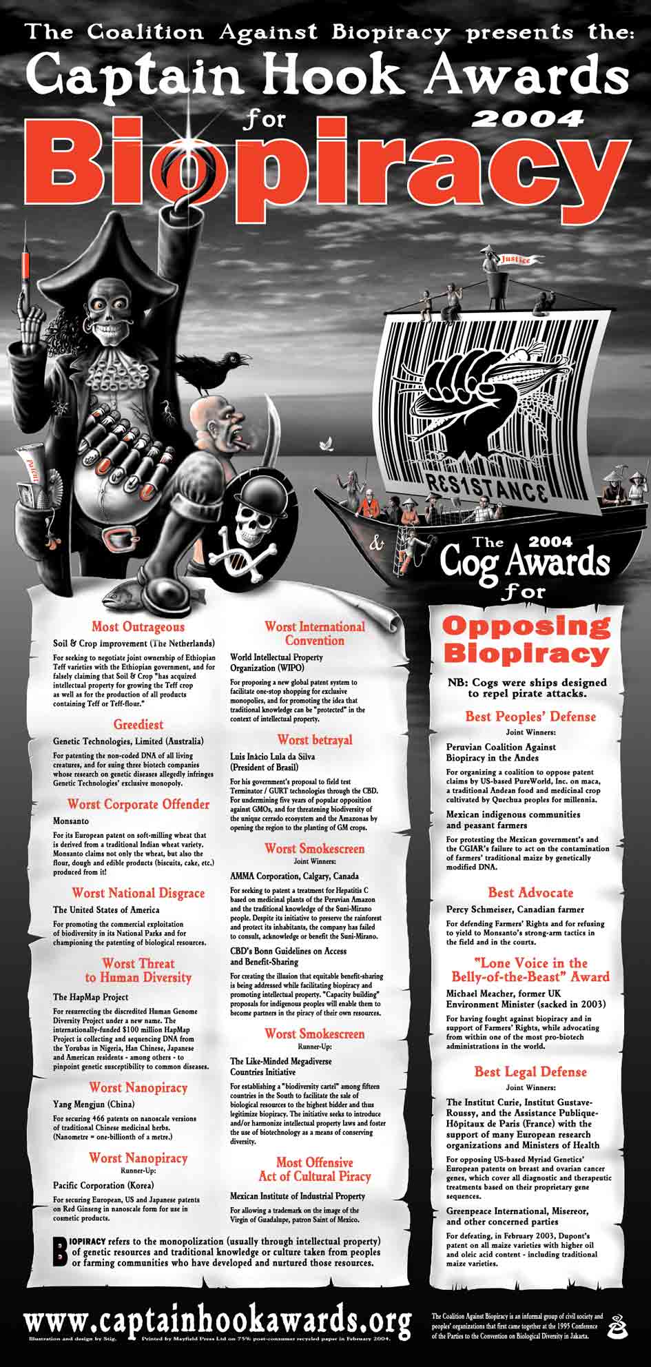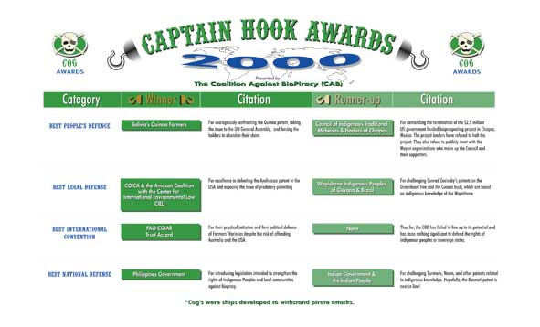 The Captain Hook Awards, awarded by the Coalition Against Biopiracy, are held at the meeting of the CBD's COP to draw international attention to the Convention's failure to provide meaningful regulations to stop biopiracy - the monopolization of genetic resources and knowledge taken from the farming communities and peoples that have developed and nurtured those resources. The Captain Hook (and Cog) Awards ceremony takes place every two years. In 2006 they were announced at the COP8 in Curitiba Brazil, in 2004 at COP7 in Kuala Lumpur, Malaysia, 2002 at COP6 in The Hague and in 2000 at COP5 in Nairobi. The Coalition Against Biopiracy is an informal group of civil society and peoples' organizations that first came together at the 1995 Conference of the Parties to the Convention on Biological Diversity meeting in Jakarta. More information about the coalition can be found here.
